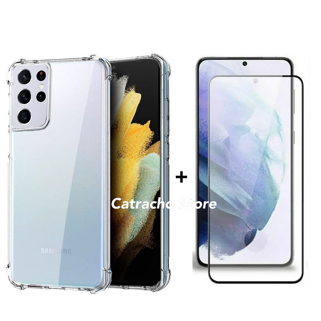 Carcasa Transparente para Samsung S21 ultra con esquinas reforzadas y protección para la cámara más lámina de vidrio completa o hidrogel.