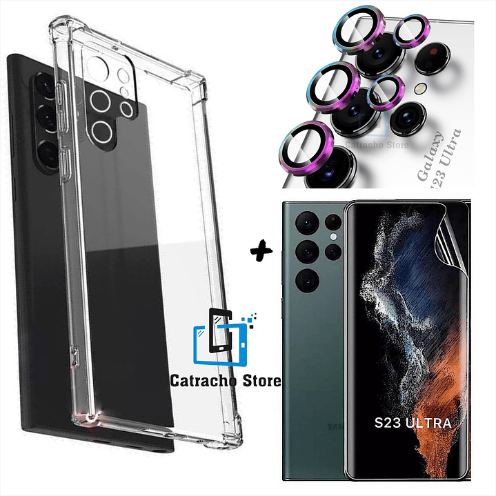 Carcasa Transparente Para Samsung S23 Ultra más lámina pantalla de hidrogel más protector de lentes material vidrio y aluminio.